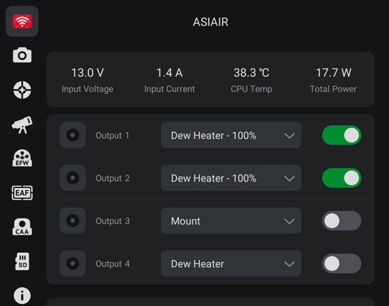 The ASIAIR status screen showed a similar power consumption value, again with some variation between about 13W and 18W; the ASIAIR was powering everything but the DSLR camera.