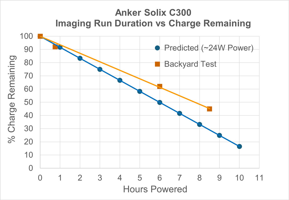That said, if you’re running a cooled astro camera (like the ZWO ASI2600MC or similar), power requirements will be higher. In that case, you should still get several hours of imaging time from the C300, but something with more capacity, like the Anker 535 PowerHouse (512Wh) or a comparable model from Bluetti or Jackery, may be a better fit.